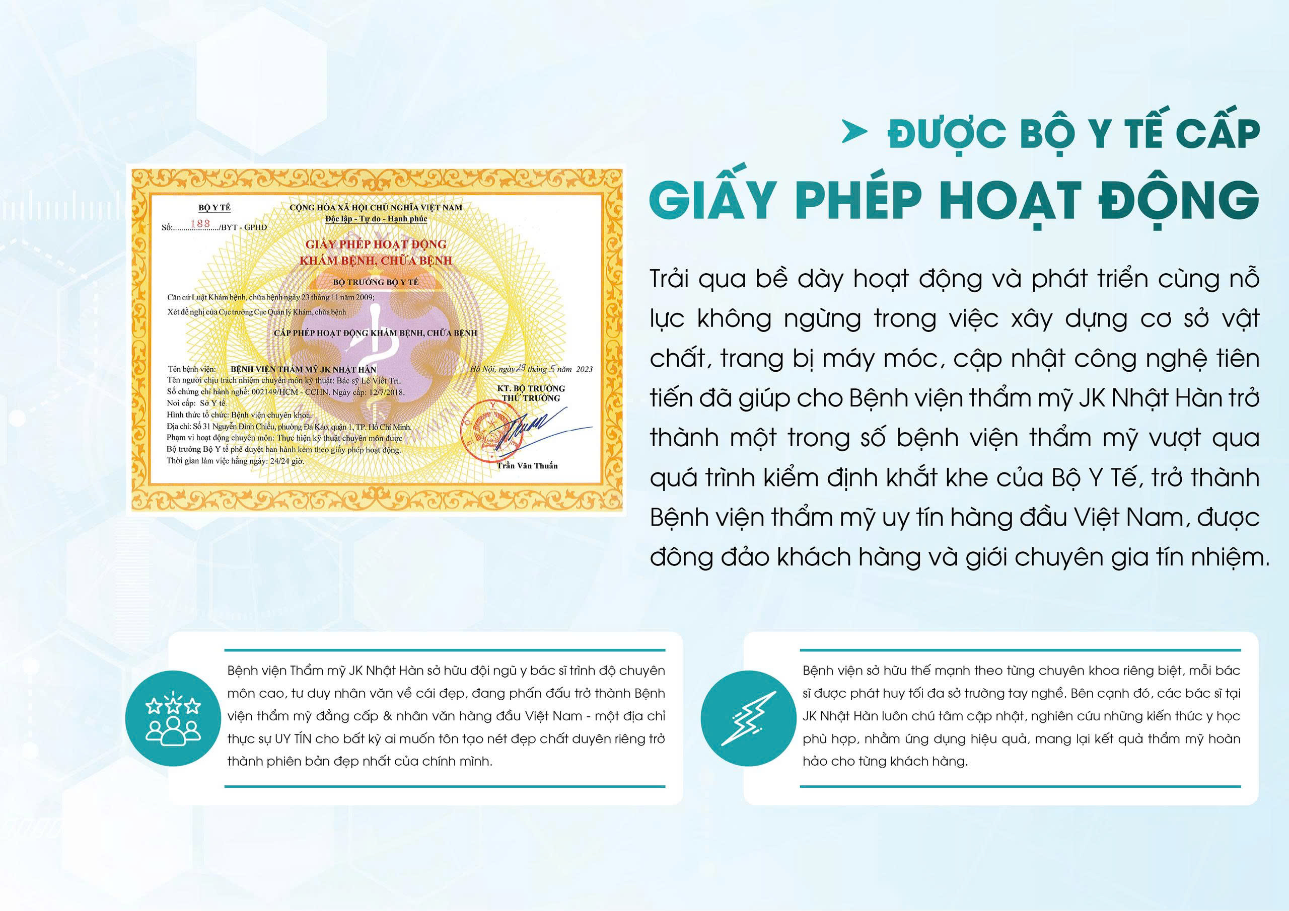 Bệnh viện thẩm mỹ JK Nhật Hàn là đơn vị chuyên sâu về tạo hình thẩm mỹ chuyên sâu và toàn diện, được cấp phép phẫu thuật nội trú với hệ thống phòng mổ vô khuẩn 1 chiều. Thế mạnh nổi bật: